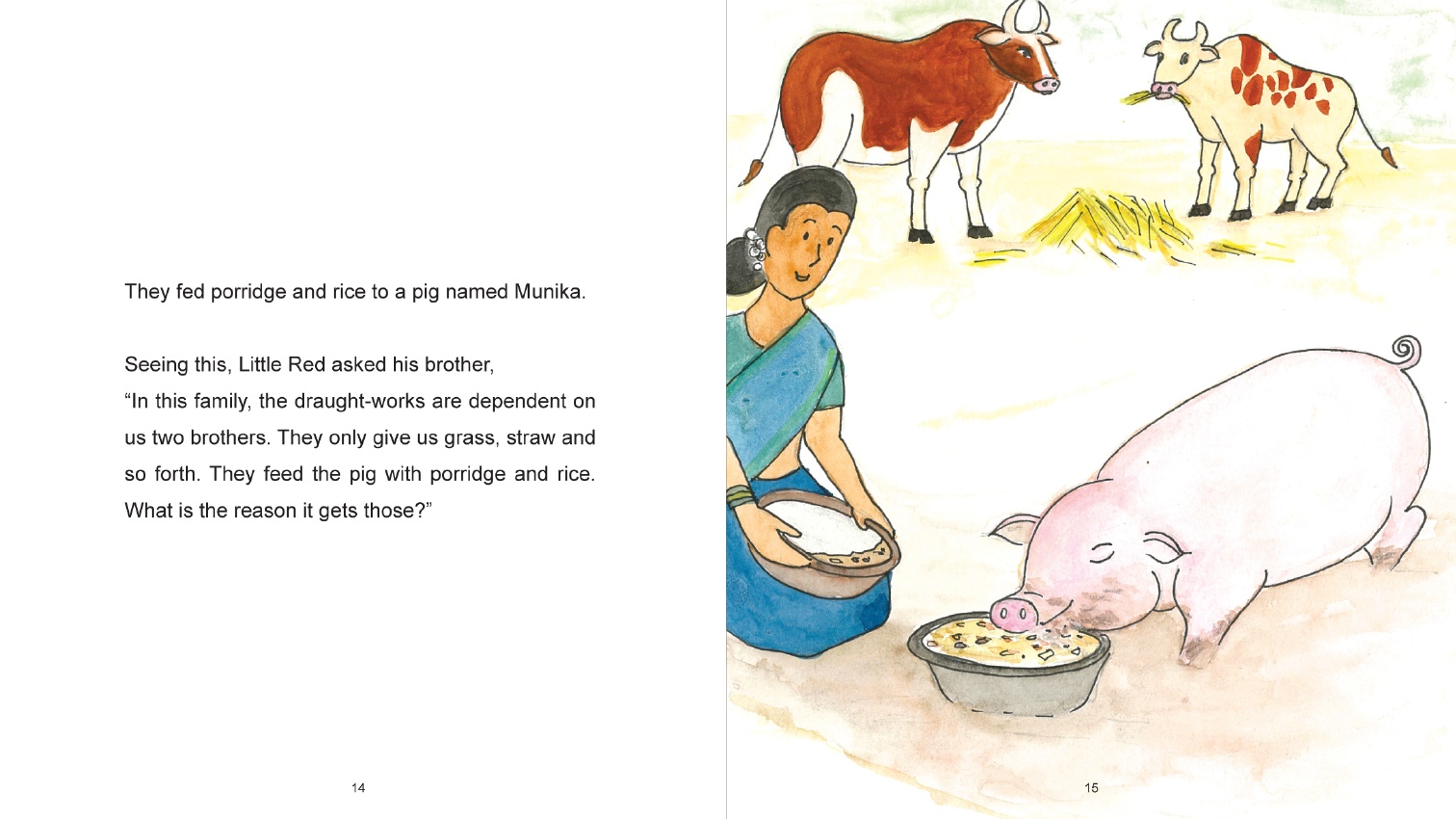A cow sees a lazy pig being offered good food and becomes dissatisfied that he has to work hard to get his food and is only eating straw. He remains dissatisfied until one day something happened to the fat pig.